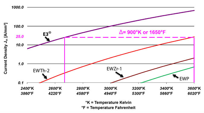 In tests the E3® electrode is shown to run approximately 1650° F cooler than thoriated at the same energy output.